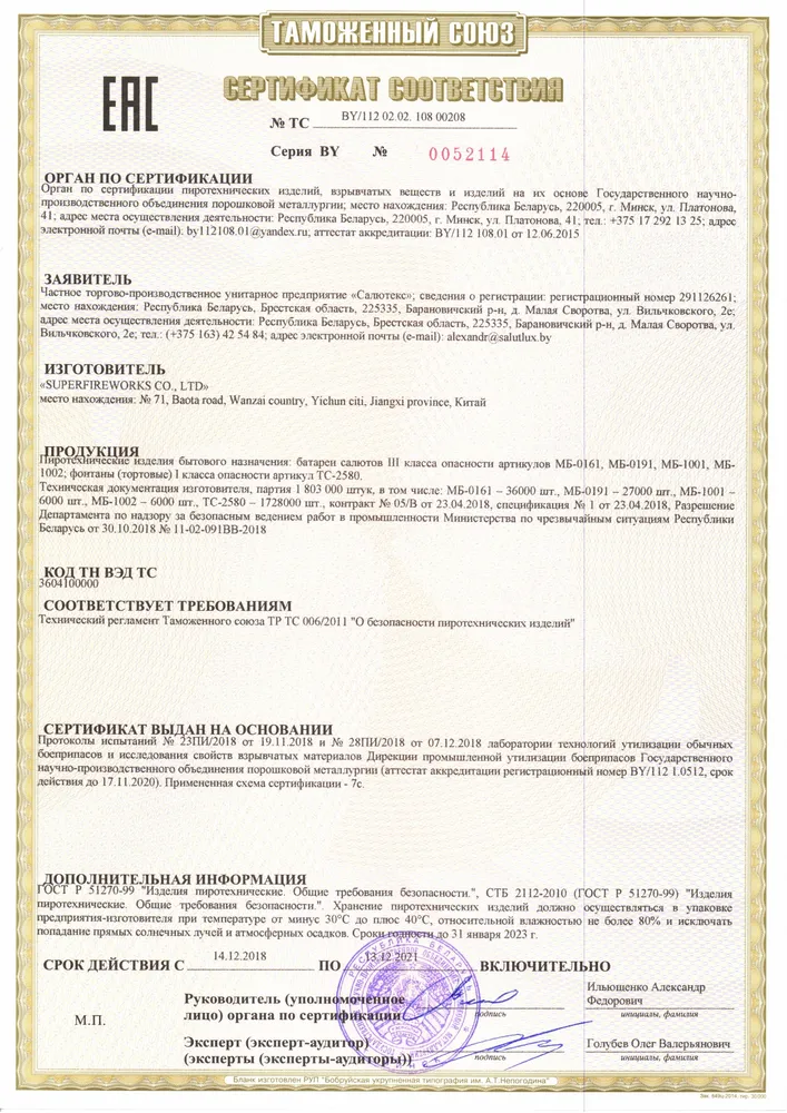 Сертификаты САЛЮТЛЮКС, TRIPLEX, САЛЮТЕКС, ПИРОСКЛАД