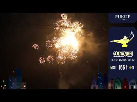 Элитный салют АЛЛАДИН БСК0116608-10-12 от пиротехнической компании PIROFF включает в себя 16 красивых эффектов: Серебряная и золотая ива; Золотая парча; Ива с красным блеском; Трещащее облако; Красно-синие сферы; Парча и синие жемчужины; Парча и красные звезды; Ива с мерцанием; Золотая ива с треском; Шуршащие пальмы; Красно-белые сферы с треском; Красно- зеленое трещащее облако; Трещащие пальмы; Цветные хризантемы; Разноцветные мерцающие пионы; Финал - цветные шуршащие пальмы.