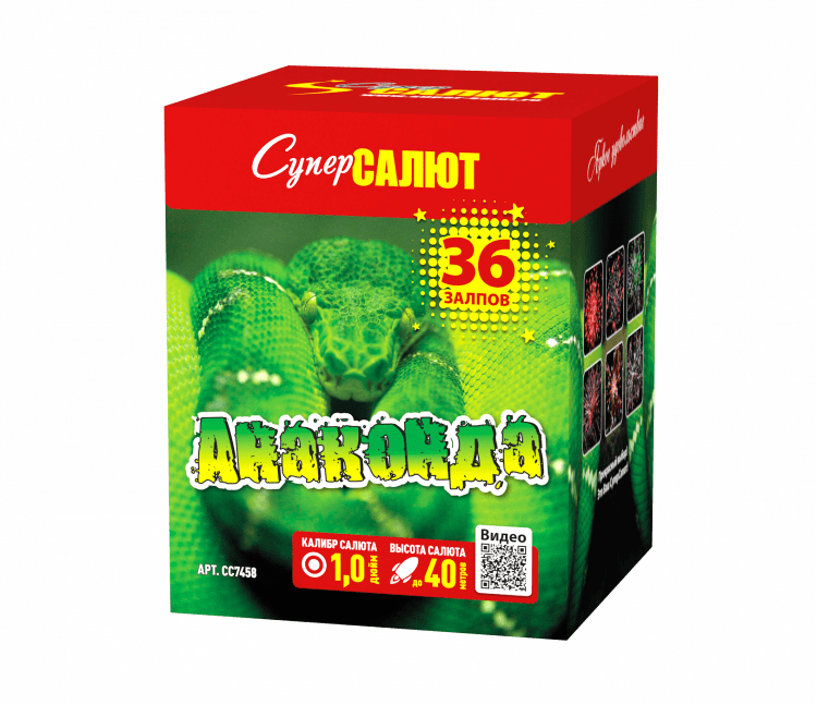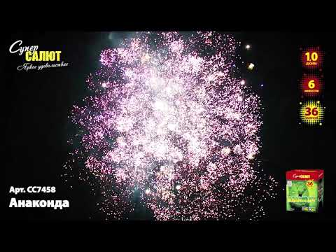 Фейерверк СС7458 АНАКОНДА от пиротехнической компании СуперСАЛЮТ состоит из 36 зарядов включающих в себя 6-ть эффектов: