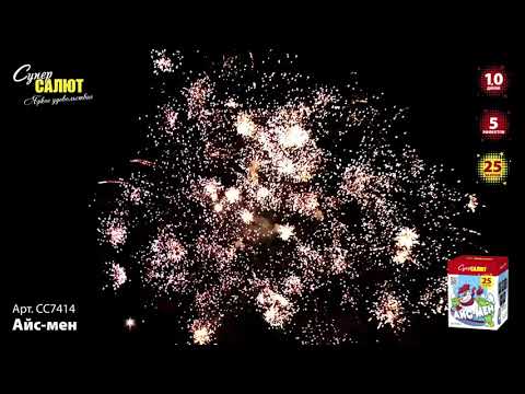 Фейерверк CC7414 АЙС-МЕН от пиротехнической компании СуперСАЛЮТ состоит из 25 зарядов включающих в себя 5-ть эффектов: 1. Красная комета раскрывается красными и зелеными кокосами с белыми мерцающими искрами. 2. Зеленая комета раскрывается пурпурными и зелеными кокосами с золотыми мерцающими искрами. 3. Оглушительный свист. 4. Синие кометы раскрываются красными и зелеными кокосами с белыми трещащими искрами. 5. В финале парчовые кометы раскрываются мерцающими парчовыми коронами и хризантемами.