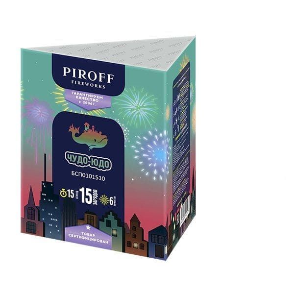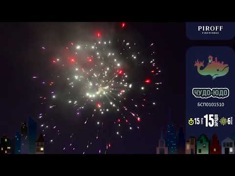 Батарея салютов ЧУДО-ЮДО БСП0101510 от торговой марки пиротехники PIROFF включает в себя 6 эффектов: цветные мерцающие пионы; пурпурно-зеленые пионы с золотым блеском; разноцветные сферы; пурпурно-зеленые пионы; золотой треск; треск и красные звезды.