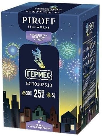 Малый фейерверк на 25 зарядов ГЕРМЕС БСП1002510 от пиротехнической компании PIROFF собрал в себе эффекты: