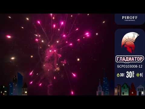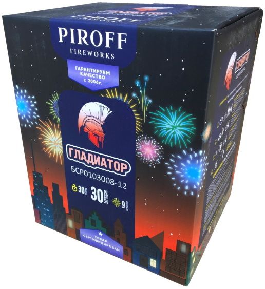Фейерверк ГЛАДИАТОР БСР0103008-12 от торговой марки PIROFF включает в себя 9 эффектов: Букет из свистящих змеек переходит в разноцветные букеты; Серебряные пионы с красными жемчужинами; Золотые ветви в красном мерцание; Золотая парча с треском; Трещащие пальмы с красным блеском; Золотая парча с синими жемчужинами; Кокос с зелеными звездами; Золотая парча с серебряным блеском; Финал – золотые облака с разноцветными жемчужинами.