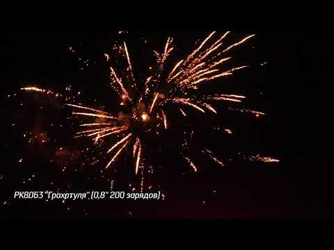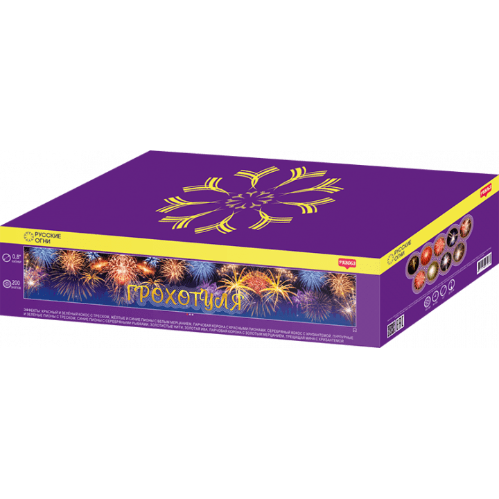 Батарея салютов PK8063 ГРОХОТУЛЯ от пиротехнической компании РУССКИЕ ОГНИ включает в себя 200 залпов 0,8 дюймов состоящих из эффектов: