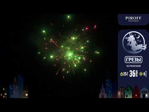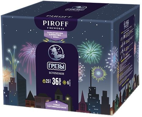 Фейерверк ГРЁЗЫ БСП0503608 от торговой марки PIROFF состоит из 36-ти зарядов с 6-ю эффектами: Парча и зеленые звезды; Цветные сферы; Золотые ивы и цветные искры; Разноцветные пионы; Треск и зеленые кометы; Золотая парча и красное мерцание.