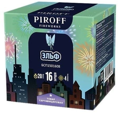 Фейерверк ЭЛЬФ БСП1501608 от производителя пиротехники PIROFF состоит из 4 эффектов: цветные пионы; красные хризантемы с треском; разноцветные сферы; золотая парча и синие звезды.