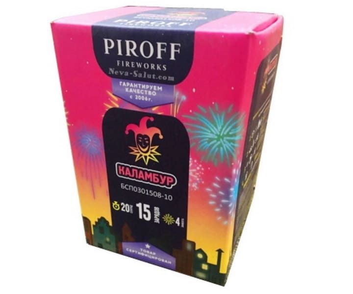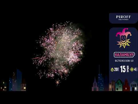 Салют КАЛАМБУР БСП0301508-10 от торговой марки ПИРОФФ состоит из четырёх эффектов: Мерцающий пион; Зеленые и синие звезды; Золотая ива с треском; Красные искры с треском.