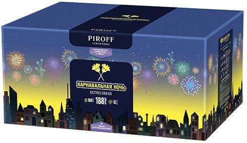 Фейерверк КАРНАВАЛЬНАЯ НОЧЬ БСП0118810 от торговой марки PIROFF состоит из 188-ми зарядов с 15-ю эффектами: Красные пионы и серебряное мерцание; Синие пионы и серебряный блеск; Золотые трещащие облака; Желто-голубой пион; Золотые пауки и синие звезды; Золотой паук с мерцанием; Парча и зеленое мерцание; Парча и красное мерцание; Пауки и красно-синие звезды; Мерцающие облака; Синие звезды и красные лепестки; Мерцающая парча; Цветные ивы с блеском; Треск и цветные звезды; Свистящие змейки.