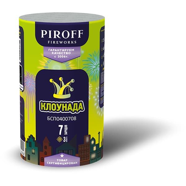 Салют КЛОУНАДА БСП0400708 от торговой марки PIROFF состоит из 7-ми зарядов с 3-мя эффектами: Золотой треск; Красные пионы; Зеленое мерцание.