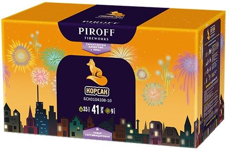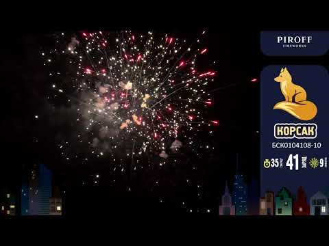 Салют КОРСАК БСК0104108-10 от торговой марки PIROFF состоит из 41-го заряда с 9-ю эффектами: Цветные мерцающие сферы; W - золотые ивы; W - мелкий треск; Бело-зеленое мерцание; W - мерцающая парча; W - крупный треск; Бело-голубое мерцание; W - золотая парча; Мерцающее облако.