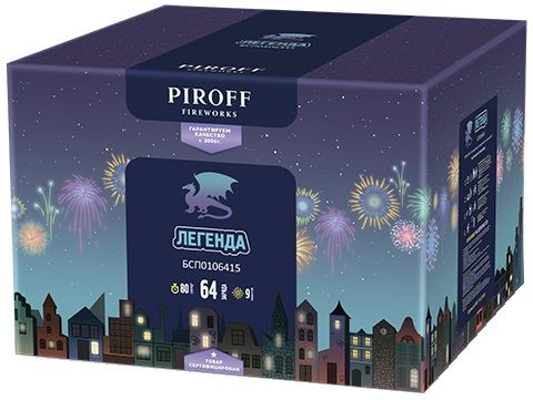 Салют ЛЕГЕНДА БСП0106415 от торговой марки PIROFF состоит из 64-х зарядов с 9-ю эффектами: Красные звезды и золотой треск; Зеленые звезды и золотой треск; Пальмы и зеленое мерцание; Золотые трещащие пальмы; Красно-синие пионы и мерцающие пальмы; Парча и красные звезды; Цветные сферы и золотые ивы; Цветное мерцание и красные шлейфы; Треск и золотая парча.
