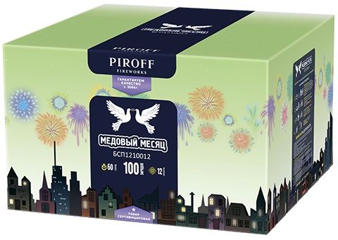 Фейерверк МЕДОВЫЙ МЕСЯЦ БСП1210012 от производителя пиротехники ПИРОФФ состоит из 12 эффектов: золотая парча; цветные облака; золотые ивы; серебряные сферы и трещащие пальмы; мерцающие сферы; золотой треск; серебряные пальмы; зеленые пальмы; золотые пальмы; трещащие пальмы; разноцветные сферы; трещащие серебряные пальмы.