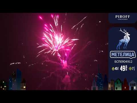 Батарея салютов МЕТЕЛИЦА БСП0904912 от торговой марки пиротехники PIROFF включает в себя 7 эффектов: разноцветные мерцающие сферы; трещащие пальмы с блеском; трещащие пальмы с синими жемчужинами; золотая парча с пурпурными звездами; серебряные сферы с синими жемчужинами; красные ивы с синими жемчужинами; финал - золотой букет из трещащих пальм.