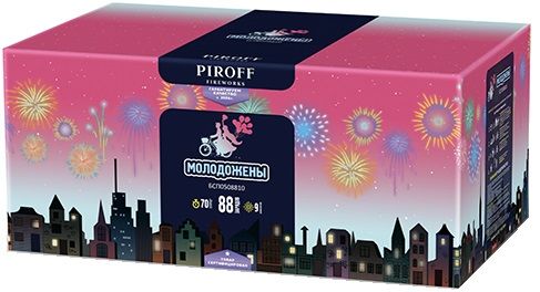 МОЛОДОЖЁНЫ БСП0508810 - это салют на свадьбу от торговой марки PIROFF состоит из 88-ми зарядов с 9-ю эффектами: Серебряные и золотые ивы; Золотые ивы с красным блеском; Треск и синие звезды; Золотые ивы; Веер из ив; Веер из треска; Парча с треском и звездами; Треск и разноцветное мерцание; Красные хризантемы с треском.