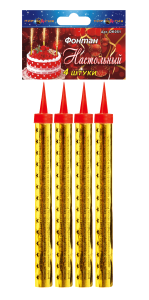 ОК051 Фонтан настольный для праздников свечи в торт 12,5 см – это разновидность фейерверка, который принято называть «фейерверк для торта». При поджигании свечи из нее вырываются ввысь трещащие золотые искры. Высота подъема потока до 30 см, время работы более 40 секунд. В упаковке 4 фонтана. Достаточно купить упаковку ФОНТАН НАСТОЛЬНЫЙ ОК051 12,5 см, что бы ваш торт заиграл новыми красками.