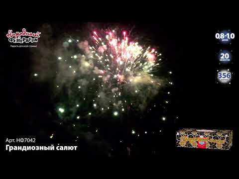 Элитный фейерверк под названием Грандиозный салют НФ7042 от торговой марки СуперСАЛЮТ - это огромное изделие включающее в себе готовое пиротехническое шоу состоящее из различных эффектов: Серебряные хризантемы с пурпурными жемчужинами; Парчовые волны с золотыми искрами; Серебряные свистящие рыбки; Зеленые кометы раскрываются трещащими; Трещащие шлейфы раскрываются синими букетами; Тысячи серебряных рыбок; Парчовые короны в ослепительном мерцании; Разноцветные букеты раскрываются трещащим облаком; Пурпурные геогрины в белоснежном мерцании; Изумрудные георгины в золотом мерцании; Золотые ивы в изумрудном мерцании; Парчовые короны с рубиновыми мерцающими звездами; Россыпь синего жемчуга в мерцающем облаке; Трещащие пальмы с красными мерцающими звездами; Золотые хризантемы с красными жемчужинами; Красные георгины с треском; Огромные трещащие хризантемы.; Парчовые букеты раскрываются тысячами хризантем.