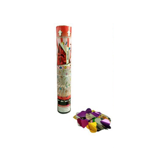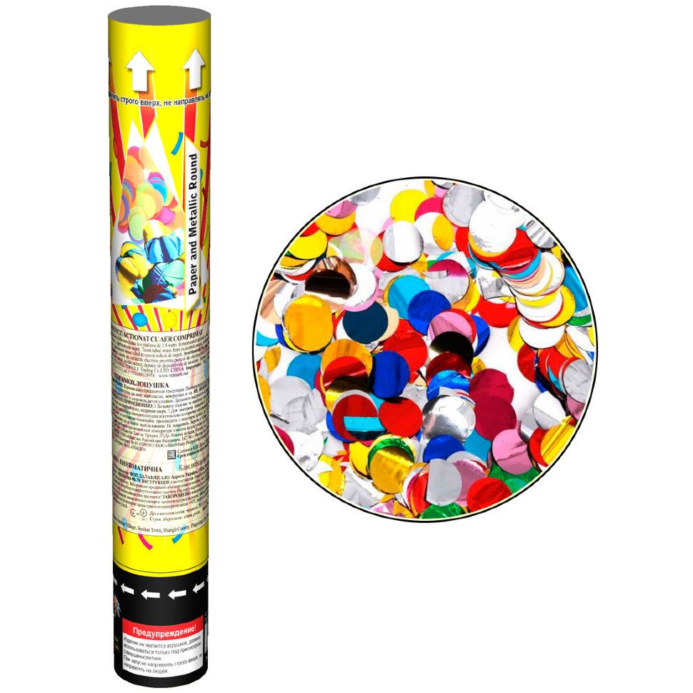 Пневмохлопушка 30 см (КОНФЕТТИ) – это вид пиротехнического изделия, внутри которого имеется специальная кнопка, баллон с углекислотой или сжатым воздухом и конфетти в различных формах. Нажимая на кнопку, происходит резкое выталкивание содержимого хлопушки под воздействием сильного потока воздуха, при этом вылетающий состав изделия может достичь высоты 10-ти метров.
