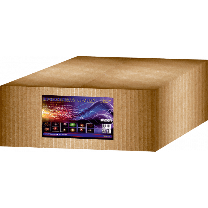 Батарея салютов PRO111-2(B) Пристегните ремни от пиротехнической компании РУССКИЕ ОГНИ включает в себя 300 разнокалиберных залпов от 1 до 2 дюймов состоящих из эффектов: