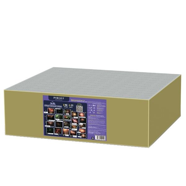 Салют РОЖДЕСТВЕНСКАЯ СКАЗКА БСК0116512 от торговой марки PIROFF состоит из 165-ти зарядов с 21-м эффектом: Красные кометы и золотой треск; Красные хризантемы с треском; Красно-белые мерцающие пионы; Сине-зеленые мерцающие пионы; Красно-синие пионы; Красные хризантемы; Зеленые хризантемы; Синие хризантемы; Цветные звезды с треском; Разноцветные сферы; Пурпурно - зеленые пионы; Оранжевые кометы и золотой треск; Оранжевые хризантемы с треском; Зеленые хризантемы в красных звездах; Серебряные хризантемы а красных звездах; Цветные трещащие кометы; Серебряно-золотые ивы; Парча и красно-белое мерцание; Золотая парча с треском; Треск и красные звезды; Парча и цветные жемчужины.