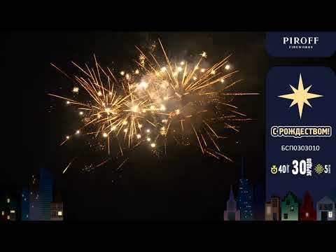 Салют С РОЖДЕСТВОМ! БСП0303010 TM PIROFF собрал в себе эффекты: разноцветные шуршащие пауки; бело-золотые ивы; мерцающие пальмы с синими или красными мерцающими жемчужинами. Финал - букет из золотых шуршащих цветов.