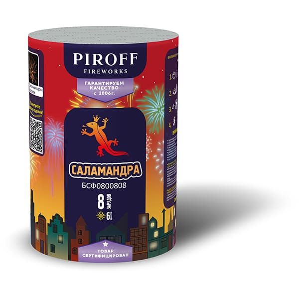 Батарея салютов САЛАМАНДРА БСФ0800808 PIROFF от торговой марки пиротехники PIROFF включает в себя 6 эффектов: Фонтан из мелкого треска; Фонтан из крупного треска; Цветочная парча с синими звездами; Цветочная парча с фиолетовыми звездами; Цветочная парча с оранжевыми звездами; Цветочная парча с треском.
