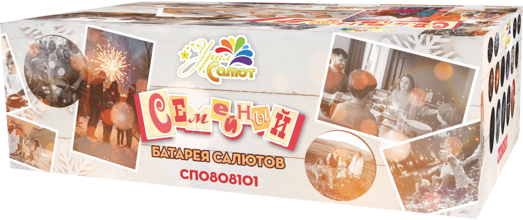 Батарея салютов СЕМЕЙНЫЙ СК0808101 от пиротехнической компании УРАЛ САЛЮТ включает в себя 261 разнокалиберных залпов от 0,8 до 1,2 дюймов состоящих из разных эффектов.