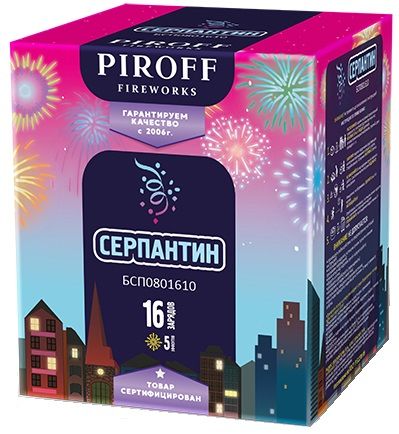 Батарея салютов 1 дюйм на 16 залпов СЕРПАНТИН БСП0801610 от пиротехнической компании PIROFF включает в себя 5 эффектов: Золотой треск и алые блестки; Пальмы с красными звездами; Пальмы с зелеными звездами; Серебряное мерцание и красные пауки; Красные стробирующие звезды и пауки; Финал - золотая ива с треском.