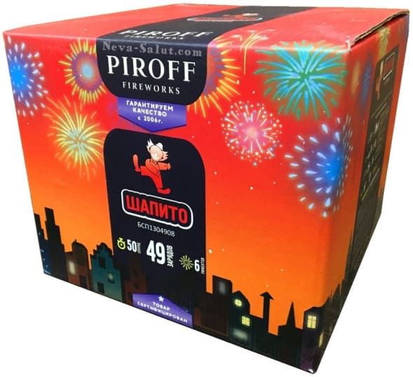 Фейерверк 49 зарядов ШАПИТО БСП1304908 от торговой марки PIROFF включает в себя 6 эффектов: Разноцветные пионы; Серебряный мелкий треск; Пальмы и красные звезды; Пурпурно-зеленые пионы; Парча с треском; Золотой треск.