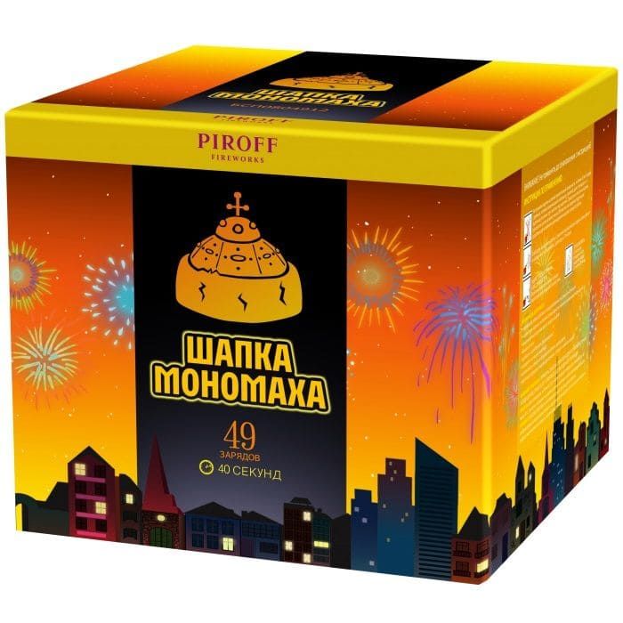 По-настоящему царский и грандиозный фейерверк ШАПКА МОНОМАХА БСП0804912 от торговой марки PIROFF собрал в себе эффекты: красные мины и свистящие пауки переходят в золотые хризантемы с разноцветными кончиками; красное мерцание с серебряными пальмами; золотые ивы в трещащем облаке; золотой треск. Финал - огромный шуршащий одуванчик.