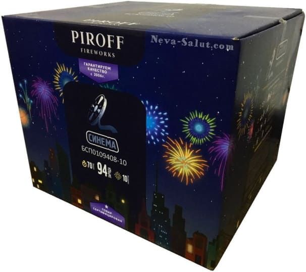 Фейерверк на 94 залпа СИНЕМА БСП0109408-10 от торговой марки PIROFF включает в себя 10 эффектов, некоторые из них: Золотой треск с красными звездами; Золотые пальмы и красные жемчужины; Разноцветные пионы с треском; Зеленые звезды и серебряные ивы; Парча и пурпурные звезды; Ивы в золотом треске; Серебряные свистящие змейки с мелким треском.