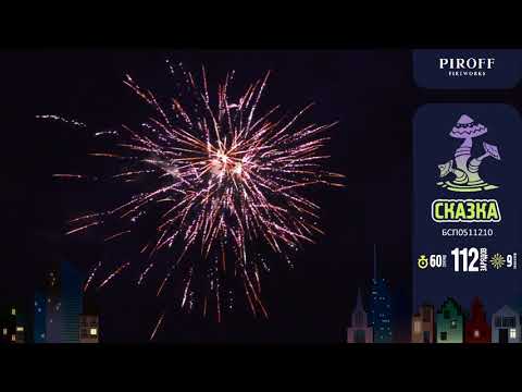 Большой фейерверк 112 залпов СКАЗКА БСП0511210 от пиротехнической компании PIROFF включает в себя 9 красивых эффектов: Красные звезды и белое мерцание; Золотая парча с треском; Красно-зеленое мерцание; Цветные мерцающие пионы; Шумовые вспышки; Красное мерцание; Золотая парча; Зеленое мерцание; Трещащее облако и разноцветные жемчужины