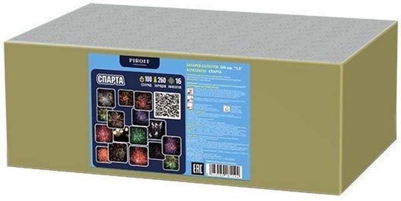 Премиум фейерверк СПАРТА БСП0226010 от пиротехнической компании PIROFF состоит из 16-ти красивых эффектов: Красно-белые пионы; Красно-зеленые мерцающие сферы; Золотые мерцание и синие звезды; Красные пальмы и синие жемчужины; Красные пальмы с красным мерцанием; Красные звезды и шуршащие ивы; Вертушки и раскаты грома; Разноцветное мерцание; Золотые ивы и зеленые звезды; Золотая парча с треском; Красно-белое мерцание; Бело-зеленое мерцание; Сине-белое мерцание; Красный треск; Золотые пальмы и разноцветные звезды; Золотая парча.