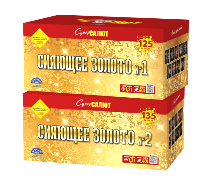 Салют СИЯЮЩЕЕ ЗОЛОТО СС8870 от пиротехнической компании СуперСАЛЮТ состоит из 260 залпов и включаетв себя следующие 19 эффектов: Красно-зеленая пальма с белым мерцанием; Золотая пальма с зелеными жемчужинами; Золотая пальма с красными жемчужинами; Золотая пальма с синими жемчужинами; Золотая пальма с белым мерцанием; Трещащая пальма с белым мерцанием; Парчовая корона с красными и зелеными жемчужинами; По бокам красные кометы с искристыми хвостами, в центре парчовые короны с изумрудными жемчужинами; По бокам зеленые кометы с искристыми хвостами, в центре белые мерцающие ивы с рубиновыми жемчужинами; Парчовая корона с белым мерцанием; Парчовая корона с изумрудным мерцанием; Парчовая корона с пурпурным мерцанием; Золотая пальма переходит в огромное трещащее облако; Белая трещащая ива с красным мерцанием; Трещащая ива с красными жемчужинами; Парчовые волны с зеленым мерцанием; По бокам красные жемчужины раскрываются серебряными букетами, в центре белая мерцающая ива с красными жемчужинами; По бокам раскрываются разноцветные букеты, в центре золотая трещащая ива с изумрудным мер.