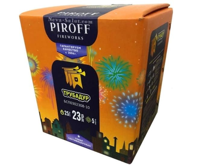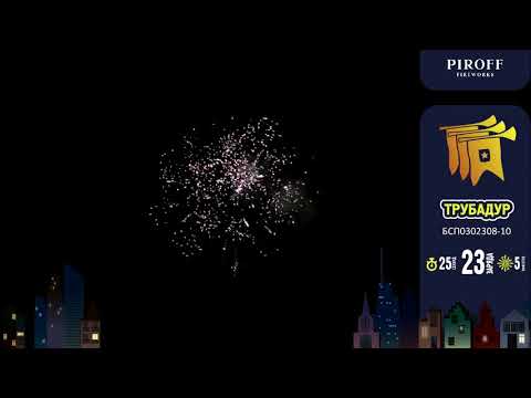 Салют ТРУБАДУР БСП0302308-10 от торговой марки ПИРОФФ состоит из 5 красочных эффектов: Красные пионы; Пурпурные пионы; Желтые хризантемы; Зеленые хризантемы; Финал - синие звезды и треск.