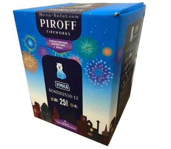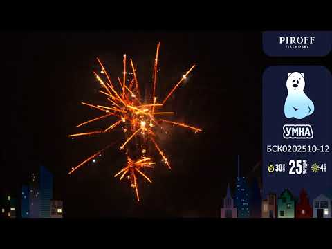Батарея салютов УМКА БСК0202510-12 от торговой марки PIROF состтоит из 5 эффектов: золотые шуршащие пауки с синими звёздами; мерцающие пионы с зелеными звездами; золотая парча с блеском; красные хризантемы с треском; финал - красное трещащее облако.
