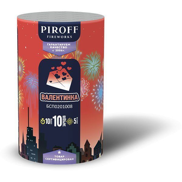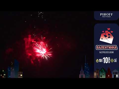 Батарея салютов ВАЛЕНТИНКА БСП0201008 PIROFF от торговой марки пиротехники PIROFF включает в себя 5 эффектов: красные пионы; золотой треск; цветные звезды с треском; красно-белый пион; парча с треском.