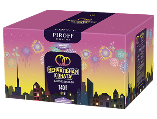 Салют ВЕНЧАЛЬНАЯ СОНАТА БСК0314008-10 от торговой марки PIROFF состоит из 140-ка зарядов с 8-ю прямыми и веерными эффектами: Ивы и цветные звезды; Цветные пионы; Свистящие змейки в трещащие букеты; Золотые ивы и серебряное мерцание; Треск и желтые звезды; Золотые кометы и красно-синие пионы; Трещащие пальмы и красные звезды; Парча и красное мерцание/