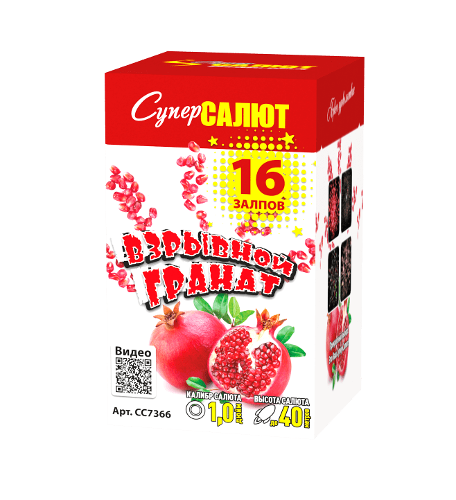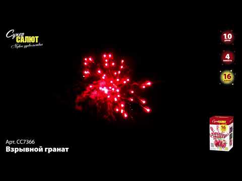 Фейерверк СС7366 ВЗРЫВНОЙ ГРАНАТ от пиротехнической компании СуперСАЛЮТ состоит из 16 зарядов включающих в себя 4 эффекта: