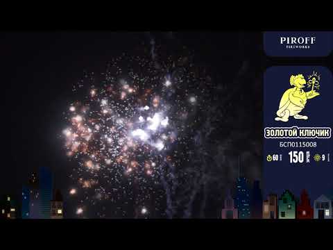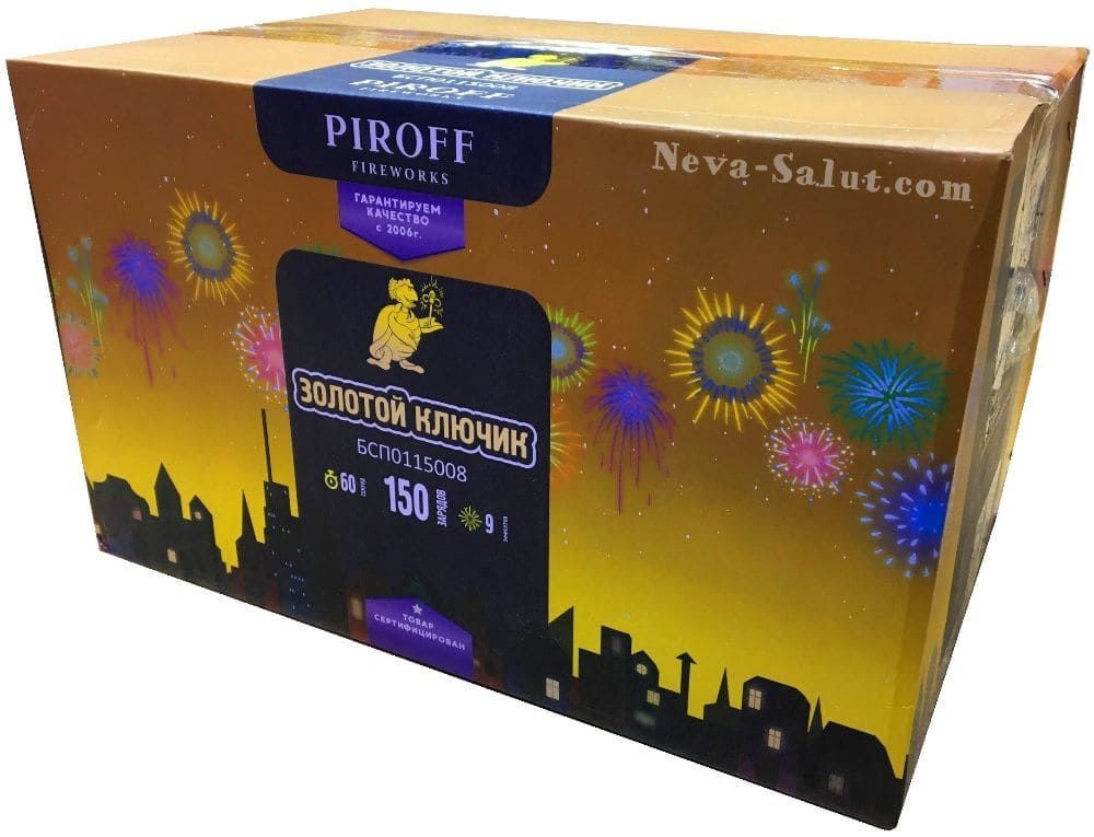 Большой фейерверк 150 зарядов ЗОЛОТОЙ КЛЮЧИК БСП0115008 PIROFF включает в себя 9 эффектов: Разноцветное мерцание; Свистящие змейки; Мелкий треск; Шуршащие пауки и красные звезды; Шуршащие цветы и зеленые звезды; Цветные хризантемы с треском; Золотая парча; Серебряные пальмы; Финал - золотое трещащее облако.